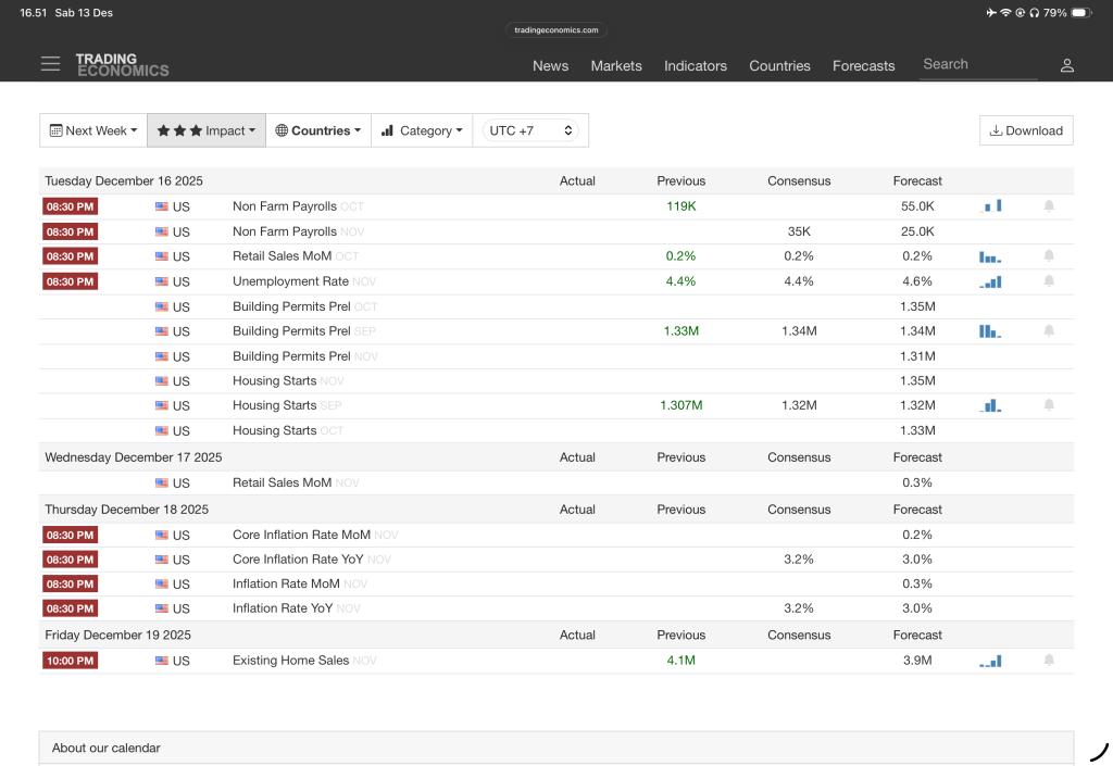 Minggu ketiga Desember 2025 adalah pekan padat data penting yang berpotensi menjadi lanjutan volatilitas pasca FOMC. Kombinasi data tenaga kerja, inflasi, dan konsumsi akan menentukan apakah The Fed memiliki ruang untuk pelonggaran kebijakan di awal tahun 2026.